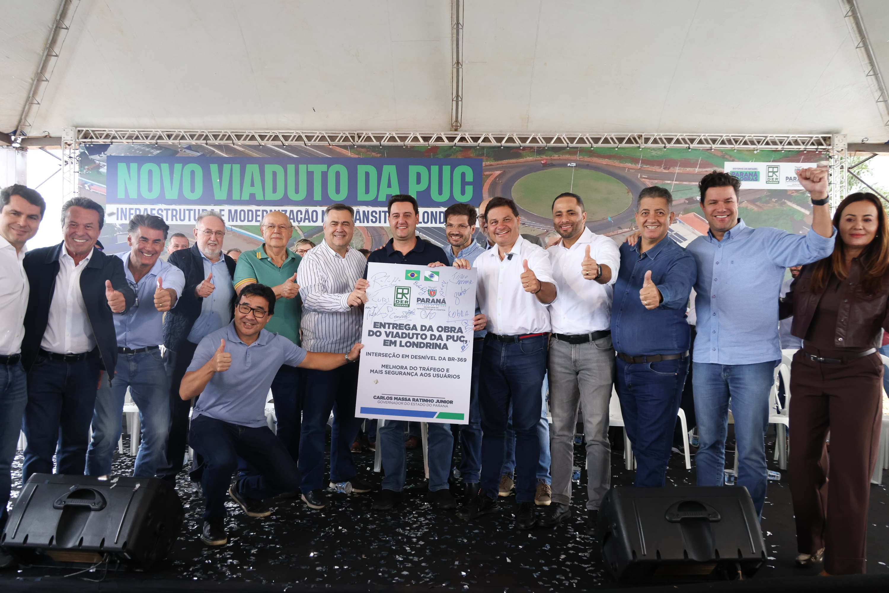 O governador Carlos Massa Ratinho Junior entregou, neste sábado (5), o novo viaduto na BR-369, com acesso à Avenida Jockey Clube e Avenida das Indústrias, em Londrina, no Norte do Paraná. Conhecido como Viaduto da PUC, a estrutura soluciona um antigo gargalo viário da cidade, melhorando a saída para o município de Cambé e o fluxo decorrente da universidade. Ao todo, o Estado investiu R$ 41,5 milhões na obra.
